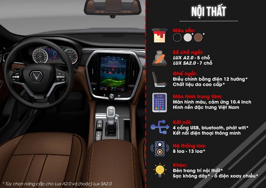 Đặc biệt hơn, trên phiên bản nâng cao của Vinfast Lux SA 2.0 bản nâng cao, bạn sẽ sở hữu trang bị sạc không dây cho hàng ghế trước, và cả một dàn âm thanh 13 loa có âm ly. Hàng ghế thứ hai nhìn chung rất thoáng và rộng rãi, với bệ tì tay và khay để cốc riêng. Tuy nhiên với cấu hình 5+2 của Lux SA 2.0, hàng ghế cuối cùng chỉ phù hợp với trẻ em, hoặc khi ngồi hai người lớn thì không nên di chuyển một hành trình quá dài. Hệ thống điều hòa của chiếc SUV thuộc dạng tự động 2 vùng độc lập, với cả cửa gió riêng cho từng hàng ghế, mang đến khả năng làm mát nhanh và đều. Ngoài ra, các cổng kết nối USB, sạc 12V, ổ điện xoay chiều 230V cũng được trang bị đầy đủ trên chiếc xe này.