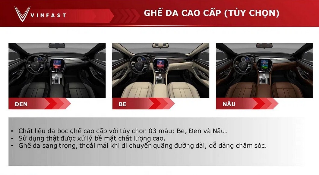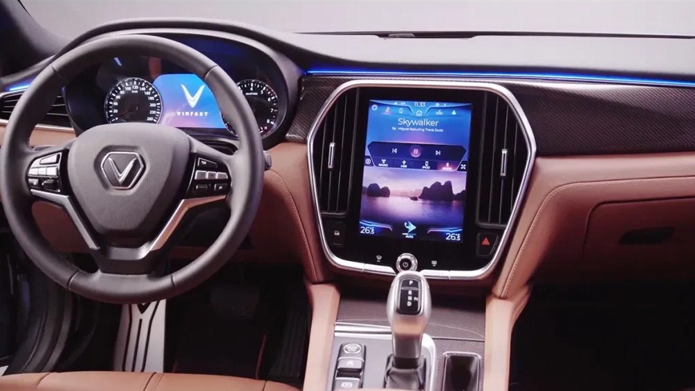 Khi bước vào bên trong cabin, bạn sẽ được chào đón bởi một thiết kế có tổng thể đơn giản và hài hòa, nhưng vẫn đủ sang trọng với mức giá 1,3 tỷ của Vinfast Lux SA 2.0 bản nâng cao. Cụ thể, vô lăng 3 chấu chữ V hiện đại sẽ được bọc da, tích hợp các nút bấm điều chỉnh âm lượng, đàm thoại rảnh tay và Cruise Control ở hai bên, trung tâm được đánh dấu bằng một logo Vinfast nổi bật. Phần taplo được chia thành 2 tầng tách biệt bằng một dải ốp hydrographic vân carbon tinh tế. Đỉnh taplo bao bọc cụm đồng hồ analog với một màn hình LCD 7 inch chính giữa, thể hiện đa dạng các thông tin hỗ trợ lái. Nổi bật nhất ở trong khoang trước chính là cụm màn hình thông tin giải trí 10.4 inch cảm ứng, có độ hiển thị sắc nét và khả năng phản hồi khá nhanh nhạy, kèm theo cả hệ thống định vị bản đồ được tích hợp.